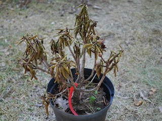 Det blir spännande att se. Här är en rododendron som absolut lämnat jordelivet.
